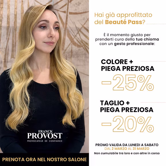 Eleganza, raffinatezza, cura dei dettagli. Con i Buoni Beauty Franck Provost, ogni gesto di bellezza si trasforma in un rituale prezioso: -8€ sul colore per illuminare la chioma con nuove sfumature -5€ sul taglio per riscoprire l'armonia dei volumi -5€ sulla piega preziosa per uno styling impeccabile Concediti un momento esclusivo, pensato per esaltare la tua unicità con classe e stile. Perché la vera bellezza è sempre un dettaglio di lusso.